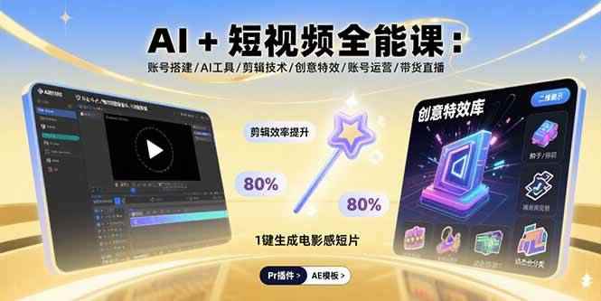 《2025AI+短视频全能课》是一门系统化短视频创作与变现的全链路课程,涵盖从账号搭建到商业变现的完整知识体系。课程以AI工具应用(文案生成、数字人制作)、剪辑技术(剪映全功能教学)、创意特效(150+热门特效教程)为核心,配套账号运营(起号涨粉)、带货直播(选品技巧)等模块,结合2025年最新平台规则,帮助学员快速掌握短视频创作的核心技能并实现流量变现。